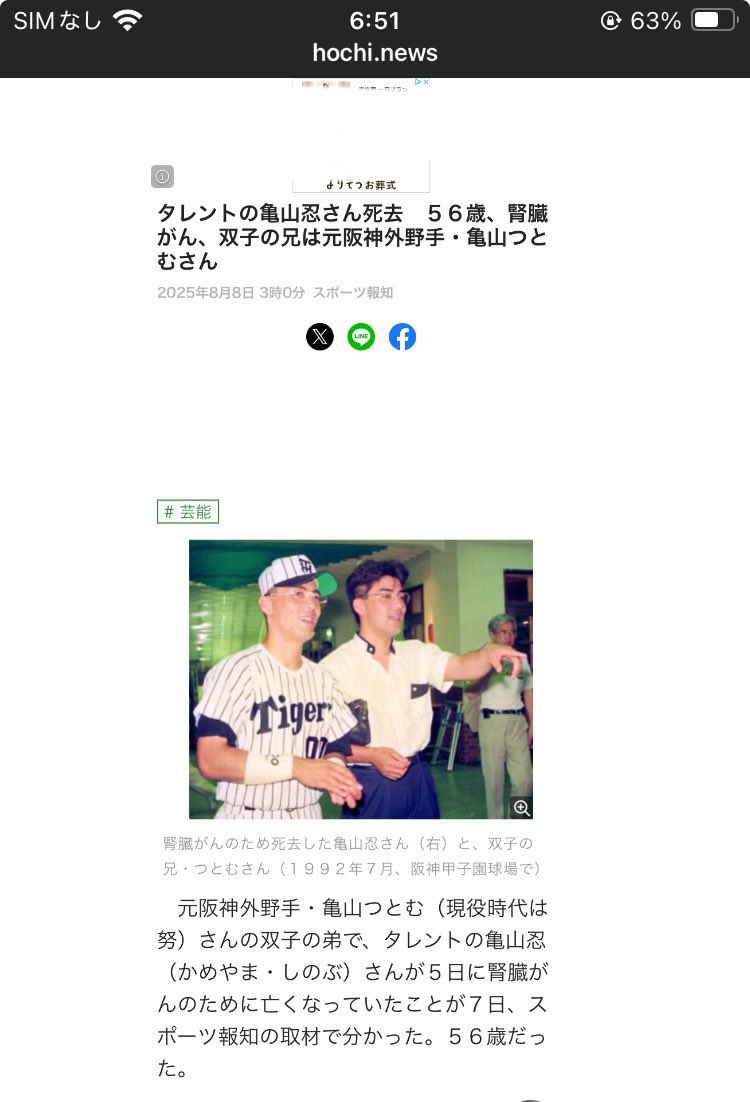 @sato31172たしかにおみかけしてなかったけど そんな、若すぎる(泣 御冥福をお祈りします タレントの亀山忍さん死去 56歳、腎臓がん、双子の兄は元阪神外野手・亀山つとむさん - スポーツ報知 hochi.news/articles/20250…